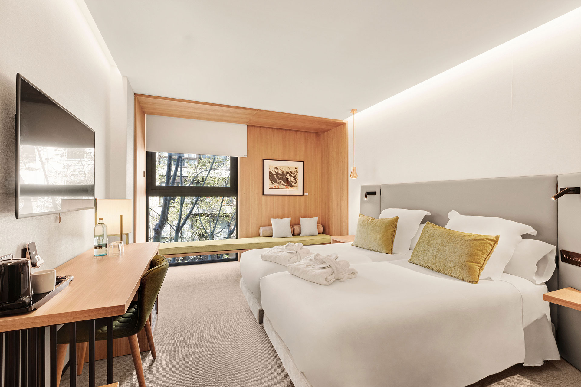 Amplias, luminosas, insonorizadas y confortables habitaciones con capacidad para 2 adultos. Smart TV LCD de 49', conexión gratuita a Internet (WIFI) de alta velocidad y baño completo con ducha y suelo radiante. Equipadas con los servicios e instalaciones que necesitas para hacer de tu estancia una experiencia inolvidable.