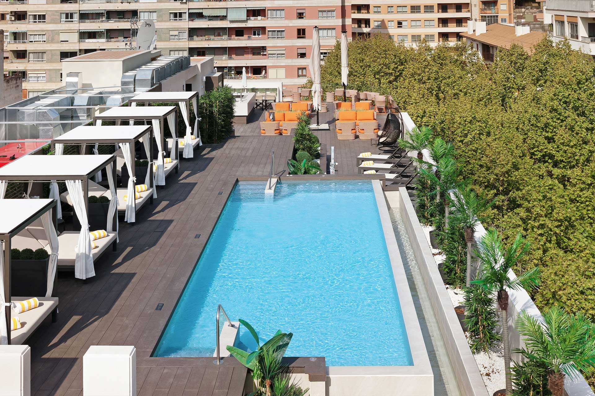 En la última planta del hotel, encontramos The Roof, con piscina al aire libre con agua a temperatura cálida, también dispone del Sky Bar con una amplia terraza chill out con vistas a la ciudad de Palma.